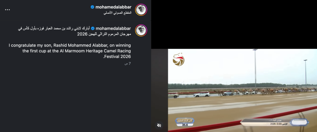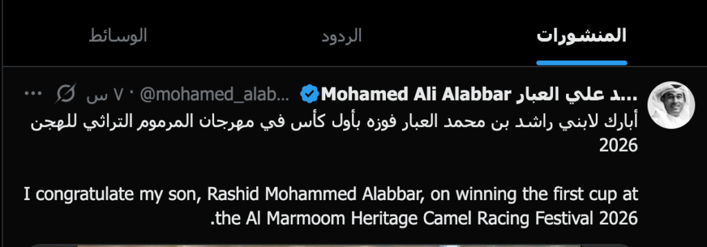 “أبارك لابني راشد بن محمد العبار فوزه بأول كأس في مهرجان المرموم التراثي للهجن 2026”، في رسالة تعكس فخره بهذا الإنجاز الذي يمثل بداية لمسيرة واعدة في عالم الهجن.