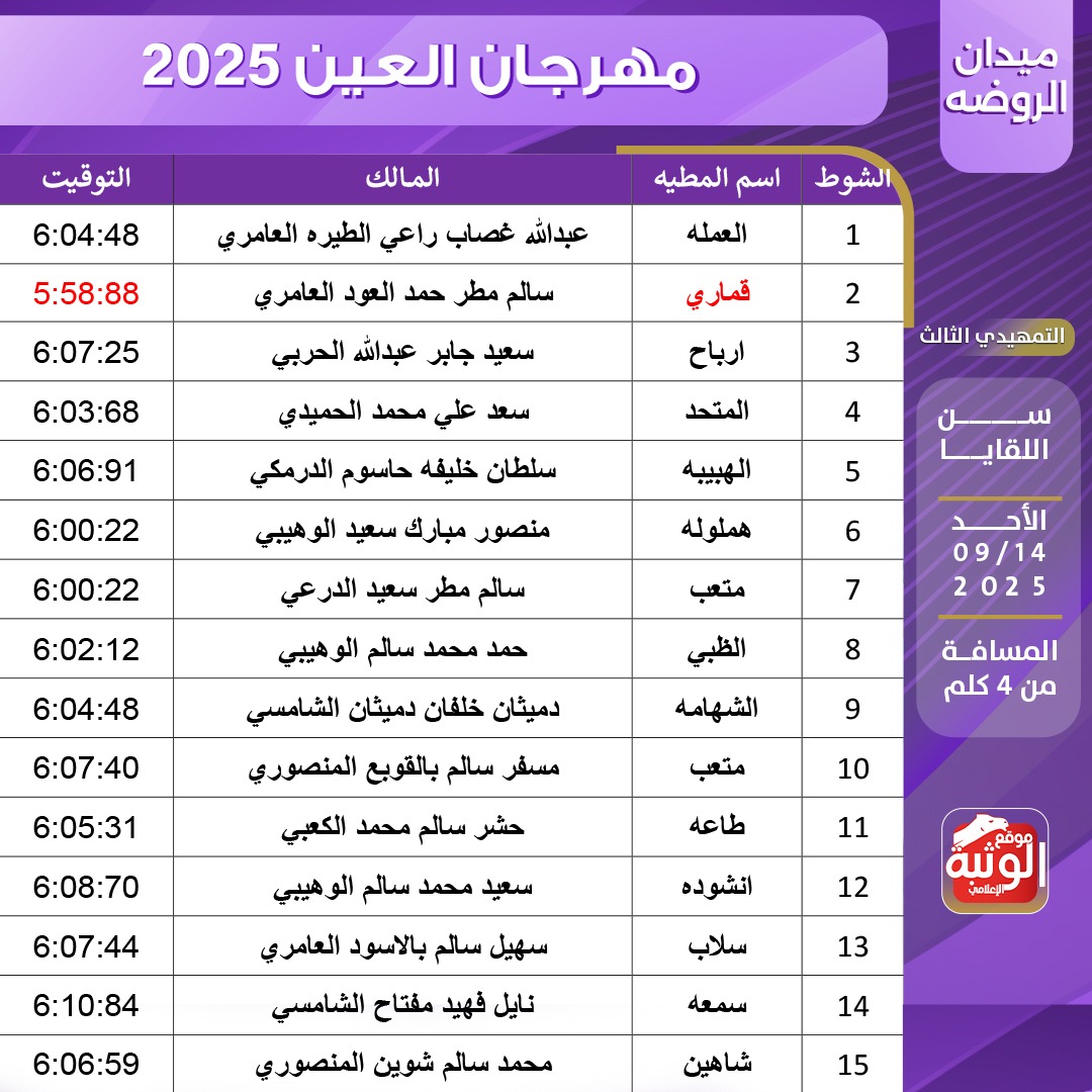 شهد ميدان الروضة صباح الأحد 14 سبتمبر 2025، تواصل فعاليات السباق التمهيدي الثالث لمهرجان العين 2025 لسباقات الهجن، والمخصص لأبناء القبائل، حيث جرت منافسات سن «اللقايا» لمسافة 4 كيلومترات في الفترة الصباحية، وسط حضور جماهيري لافت ومتابعة كبيرة عبر المنصات الإعلامية.