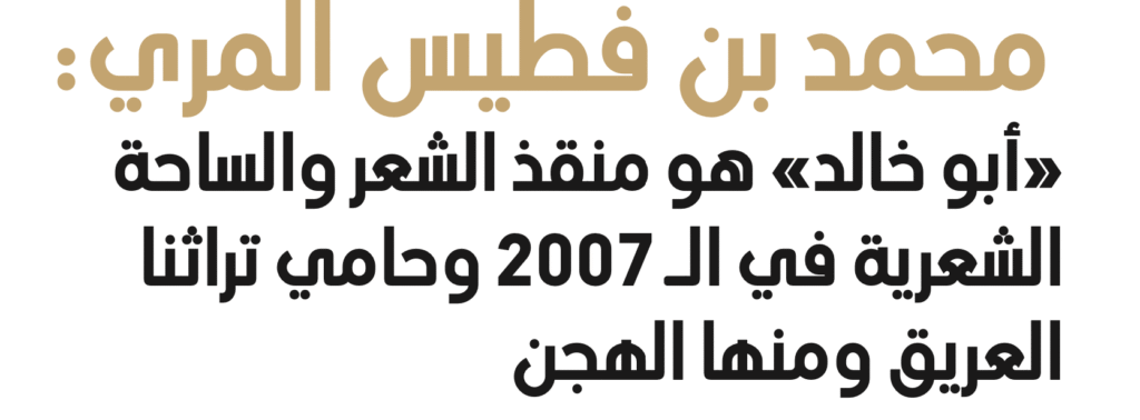 بكل فخر واعتزاز يطل علينا الشاعر محمد بن فطيس المري، حامل إرث الشعر الأصيل وروح رياضة الهجن العريقة، في حوار حصري لـ «أصايل الإبل» ينبض بحكايات تُبرز محطات حياته، وتُجسد ارتباطه العميق بالشعر والهجن، مع لمسة فنية تعبّر عن وفائه للقيادة الرشيدة، وتقديره العميق لصاحب السمو الشيخ محمد بن زايد آل نهيان، «بو خالد»، رئيس الدولة، حفظه الله، الذي أرسى دعائم حفظ الموروث الثقافي ورفع راية الشعر والهجن عالياً.