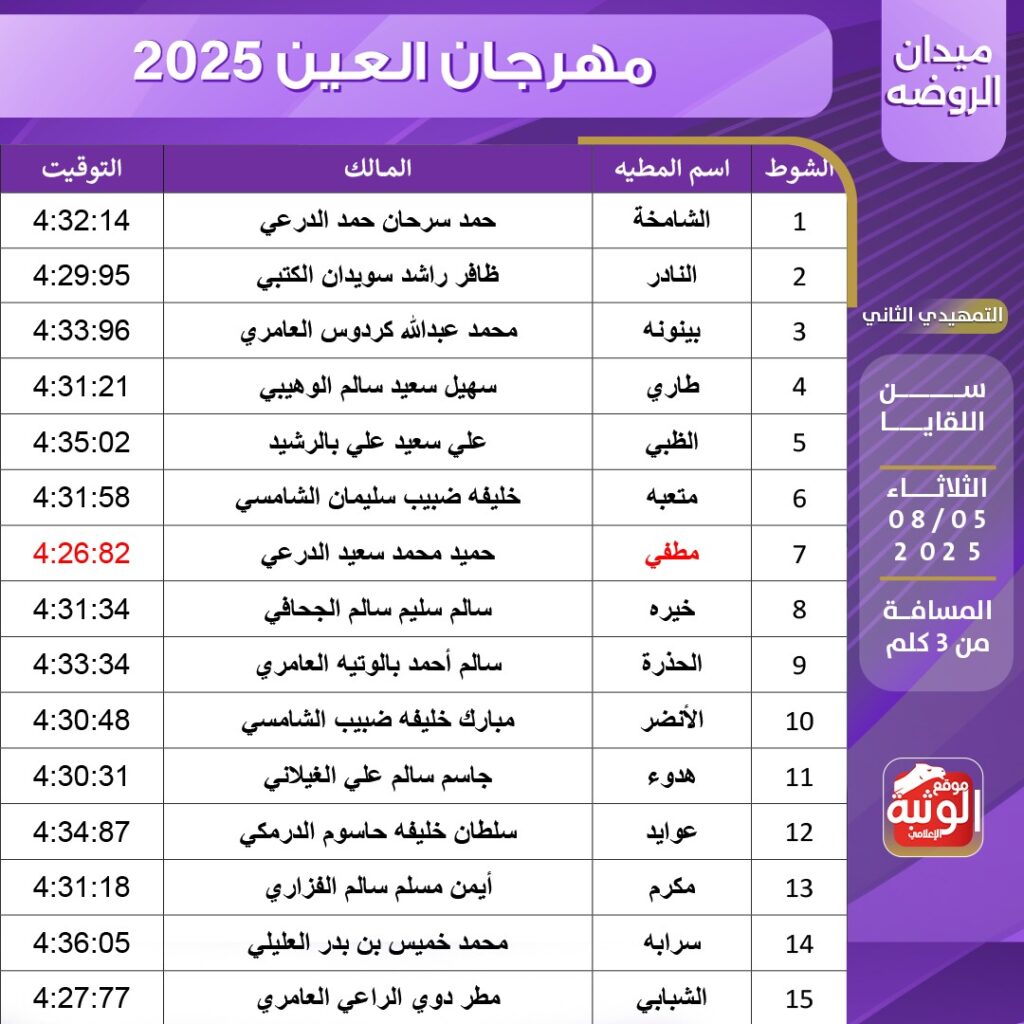 - الشوط 7: “مطفي” لـ حميد محمد سعيد الدرعي – 4:26:82 (أسرع توقيت لليوم)